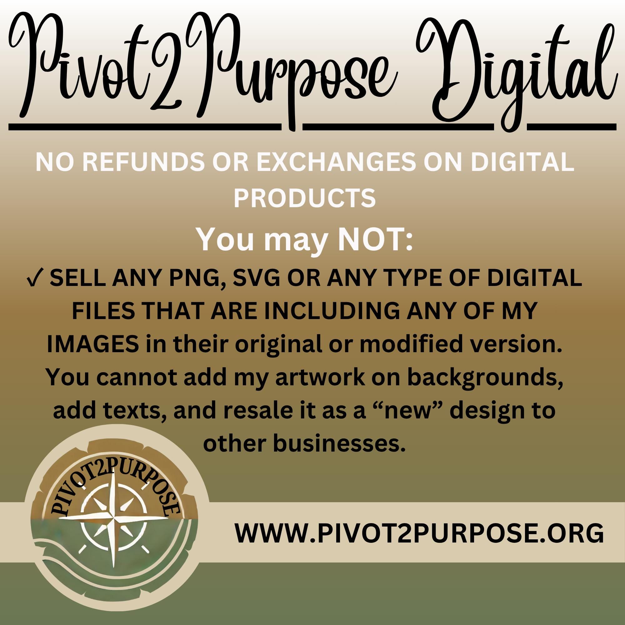 ✓ SELL ANY PNG, SVG OR ANY TYPE OF DIGITAL FILES THAT ARE INCLUDING ANY OF MY IMAGES in their original or modified version. You cannot add my artwork on backgrounds, add texts, and resale it as a “new” design to other businesses.